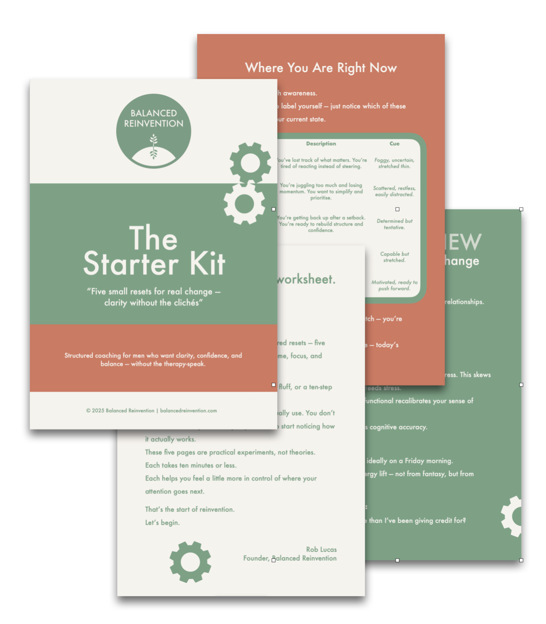 I’m Rob, founder of Balanced Reinvention — a structured coaching approach built for men who want to take back control of their direction, energy, and focus.